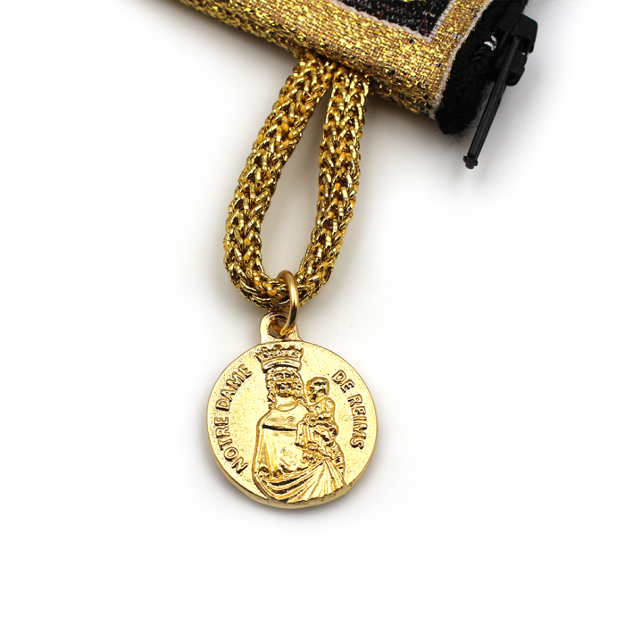Pochette icône tissage or à l'effigie de la Vierge à l'Enfant. Visuel des 2 côtés. Personnalisée par une médaille en métal doré spécifique à la cathédrale de Reims, la Vierge couronnée à l'Enfant du portail central sur une face et une représentation de la cathédrale sur l'autre. Fermeture éclair, intérieur noir. Dimensions 10 x 15 cm.