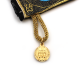 Pochette icône tissage or à l'effigie d'une magnifique et classique Vierge à l'Enfant. Visuel des 2 côtés. Personnalisée par une médaille en métal doré spécifique à la cathédrale de Reims, la Vierge couronnée à l'Enfant du portail central sur une face et une représentation de la cathédrale sur l'autre. Fermeture éclair, intérieur noir. Peut servir de pochette à chapelet. Dimensions 7 x 10 cm.