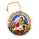 Très belle image de la sainte Famille reproduite sur un palet de bois peint en blanc cassé. Texte en italien au dos "La tendresse de Dieu pour les hommes nous est donnée par le divin Enfant". Rouge intense pour le noeud sur le houx donnant une impression de relief. A accrocher dans le sapin par une cordelette dorée. Diamètre 7,5 cm. Fabriqué en Italie.